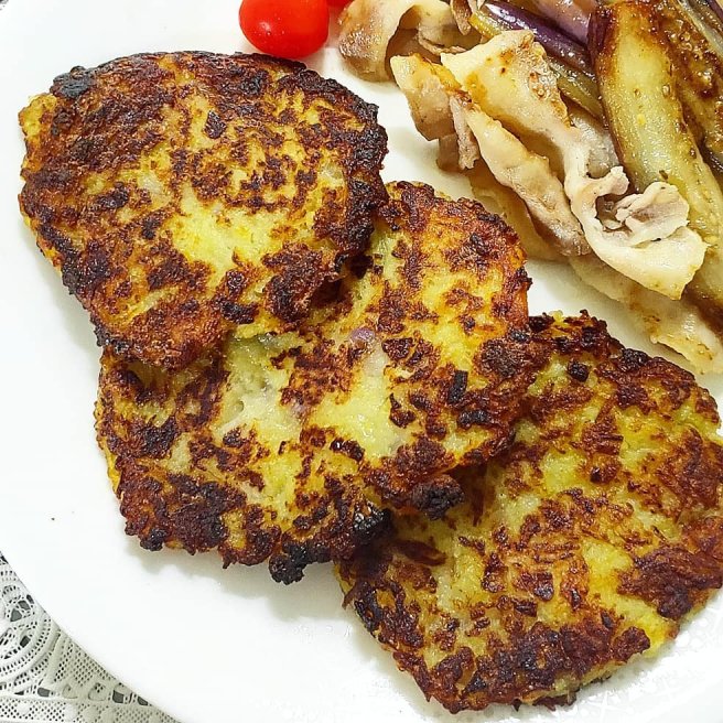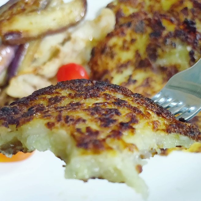 3) Flip the potato pancake to the other side and continue on low fire until crisp or golden brown.